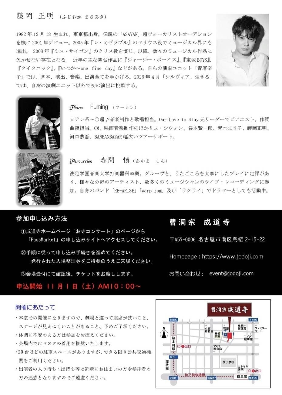 ※藤岡正明FC会員のチケット先行はございません。成道寺さんのみでのお取り扱いとなります。